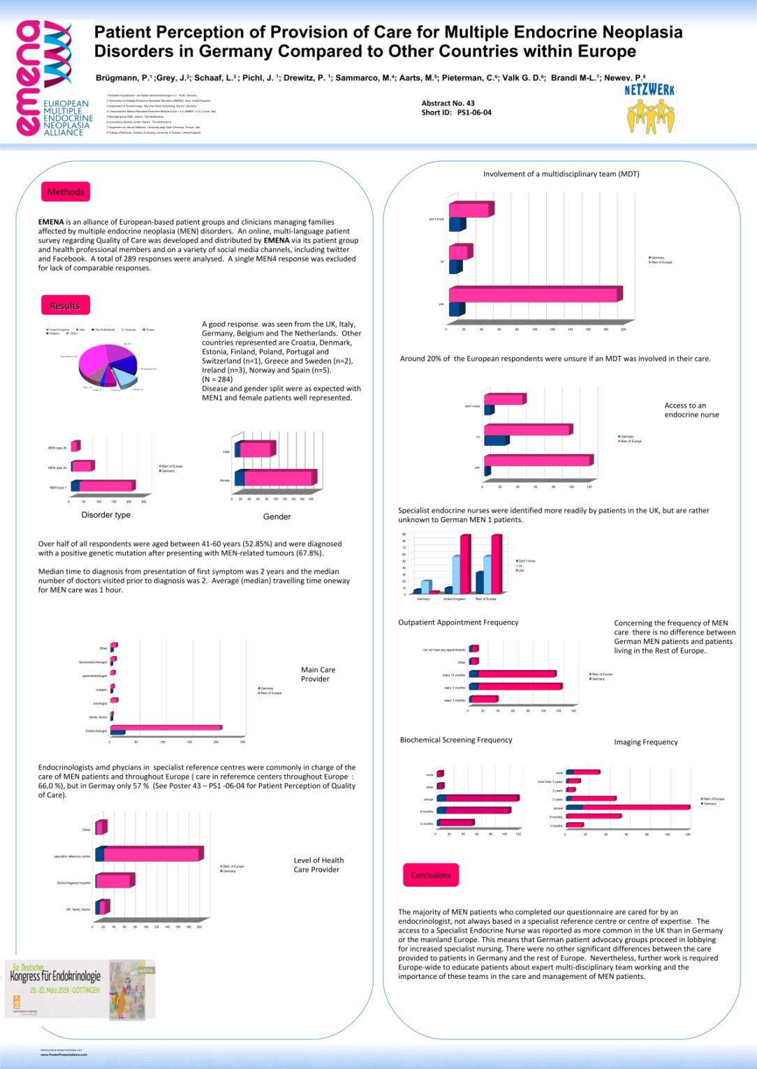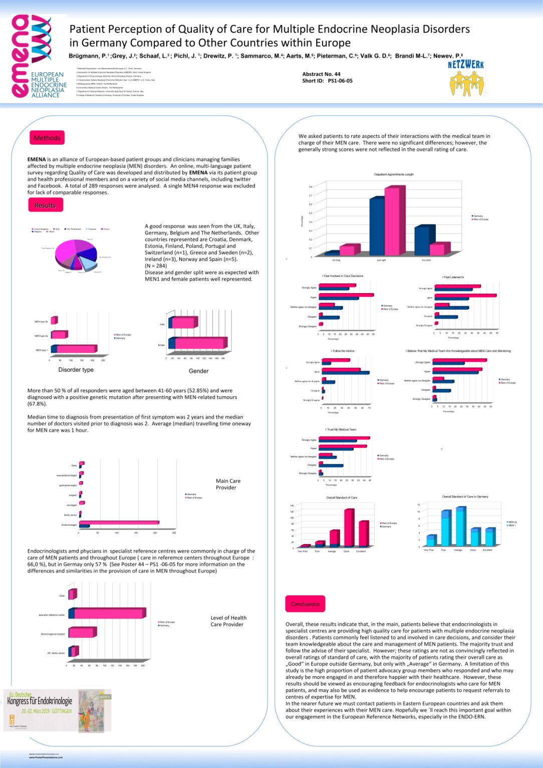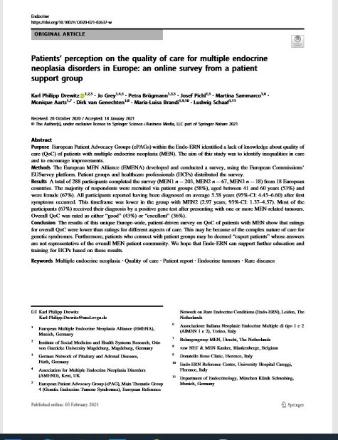 European Patient Advocacy Groups (ePAGs) within the Endo-ERN identified a lack of knowledge about quality of care (QoC) of patients with multiple endocrine neoplasia (MEN). The aim of this study was to identify inequalities in care and to encourage improvements.