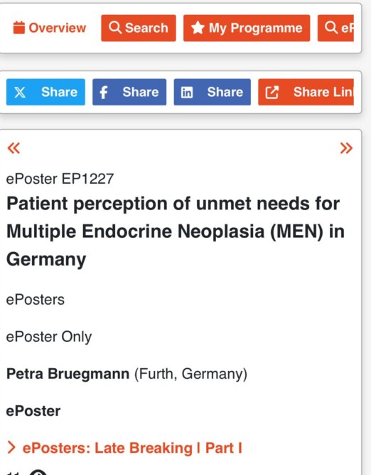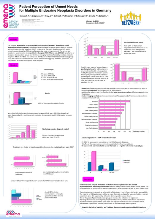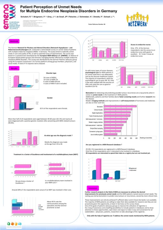 This survey focused on the unmet needs of MEN patients and their families in Germany. One important result concerns the registers: many patients would be willing to make their data available for research purposes. However, not all patients are fully informed about this possibility. Therefore, it is essential to address these patients’ wishes and create opportunities to publicise the registries. Other patient requests relate to the development of improved methods for predicting tumour growth, with the development of biomarkers, particularly for pNETs, have highest priority.